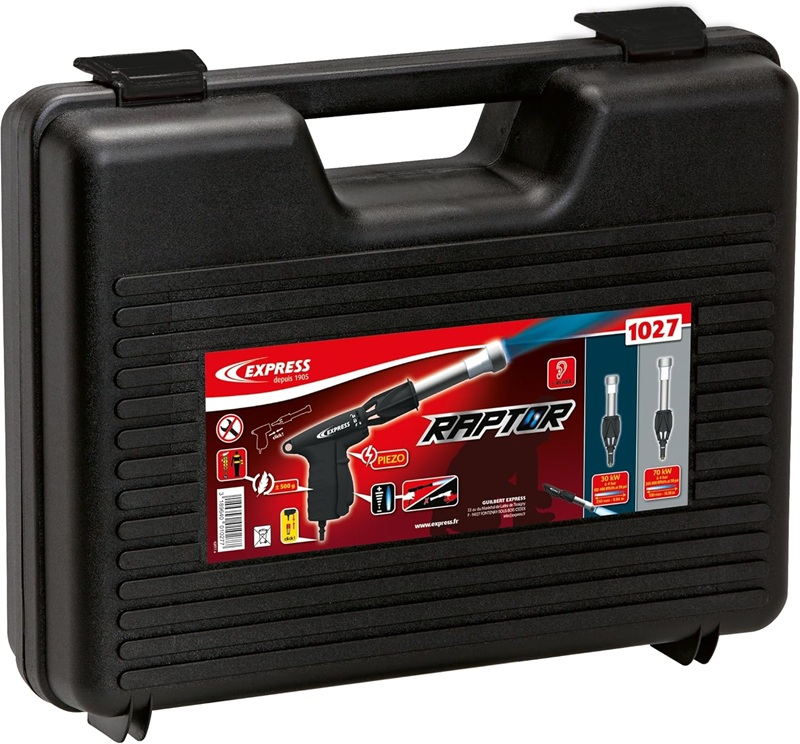 Guilbert Express profesionálny, vysoko výkonný plynový horák Raptor s piezzo zapaľovaním, bezpečnou rukoväťou s rýchlospojkou. Vymeniteľné horáky bez použitia náradia, ľahký titánový horák, ktorý odoláva veľmi vysokým teplotám, nárazom a erózii. Pripojenie hadice jedným kliknutím vďaka rýchlospojke. Jednoduchá údržba: výmena spúšte/piezoelektrického zapaľovania tiež nevyžaduje žiadne náradie. Trojpolohové označenie: výmena horáka, skladovanie, zapaľovanie. Bezpečné zapaľovanie s nízkym prietokom plynu. Bezpečnostná rukoväť (horák sa vypne, keď obsluha uvoľní rukoväť). Veľmi ľahký (cca 500 g) s nízkou hladinou hluku (< 81 dBA). Bezpečnostná rukoväť, ktorou je Raptor vybavený, prispieva k významnému zníženiu spotreby plynu a tým: znižuje emisie CO2, zabraňuje riziku náhodných požiarov na pracovisku a s tým spojeným škodám na zdraví a majetku. Horák Raptor ponúka vysoký výkon s cieleným plameňom a má k dispozícii rad horákov v rozsahu od 30 do 160 kW. Raptor vám umožňuje vykonávať práce, ktoré vyžadujú vysoko presný plameň. Sada v pevnom a praktickom kufríku obsahuje: bezpečnostnú rukoväť, trysku Raptor 30 kW – kat. č. 1030, trysku Raptor 70 kW – kat. č. 1070, rýchlospojku kat. č. 911.