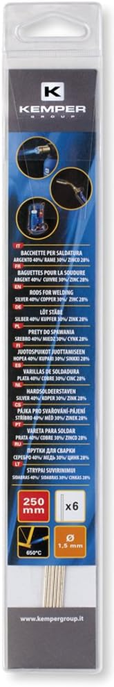 Kemper kvalitná tvrdá spájka Cu 60% + striebro 40%. Priemer Ø 1,5 mm. 6 ks v balení / l = 250 mm. Pevnosť 440N / mm2. Teplota tavenia: 640°C. Čistá hmotnosť: 24 g. Na tvrdé spájkovanie železných a neželezných materiálov.