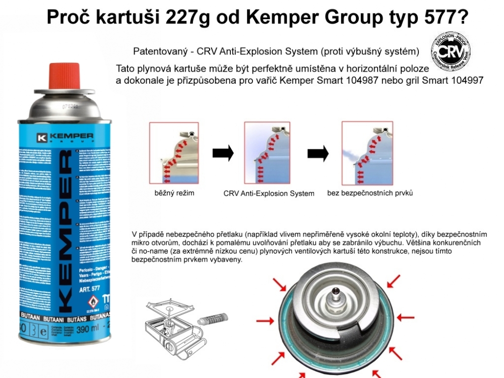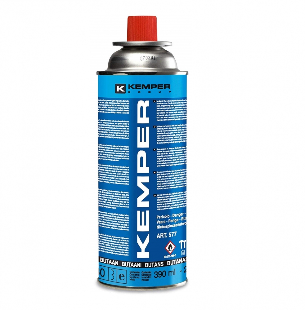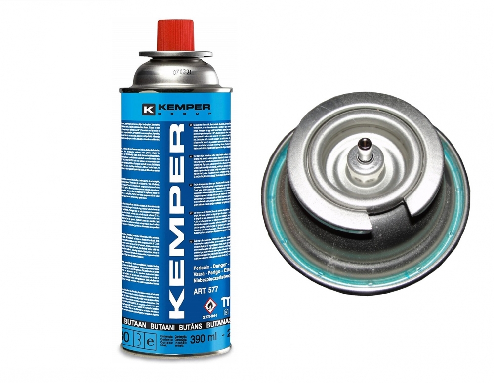 Originálna Kemper bajonetová butánová kartuša vhodná najmä pre kempingové variče či ohrievače, horáky na burinu a spájkovacie či créme brulée horáky. Pre väčšiu odolnosť a bezpečie je kartuša vybavená prídavným tesnením v prelise. Obsahuje Bután 100%, hmotnosť obsahu 227g, obsah 390ml, dosiahnuteľná teplota plameňa je 1200°C. Vyrobené podľa EN 417.